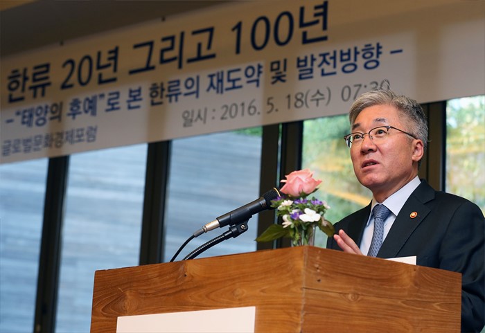 (서울=포커스뉴스) 18일 서울 여의도 대신증권에서 열린 ‘글로벌문화경제포럼’에 참석한 김종덕 문체부 장관이‘태양의 후예로 본 한류 재도약 및 향후 발전방향’이라는 제목으로 강연을 하고 있다. <사진제공=문화체육관광부>