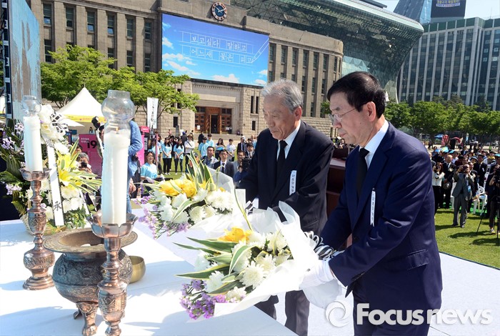 (서울=포커스뉴스) 18일 오전 서울 중구 서울시청 서울광장에서 열린 5.18민주화운동 제36주년 서울기념식에서 박원순 서울시장과 박석무(왼쪽) 행사위원장이 헌화를 하고 있다.