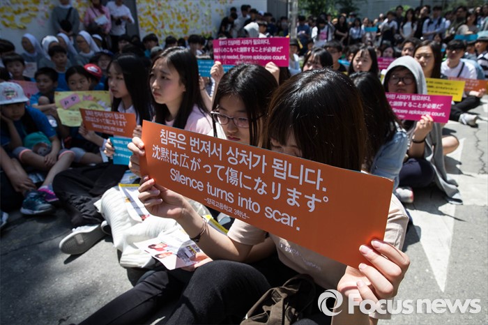 (서울=포커스뉴스) 18일 오후 서울 종로구 옛 일본대사관 앞에서 열린 '제1231차 일본군 위안부 문제해결을 위한 정기 수요시위'에 참석한 학생들이 일본의 사과를 촉구하는 손펫말을 들고 있다.