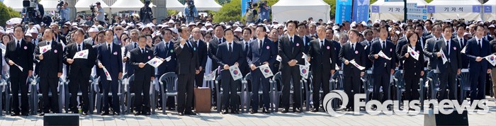 (광주=포커스뉴스) 36주년 5·18민주화운동 기념식이 거행된 18일 오전 광주 북구 운정동 5·18민주묘지에서 황교안 국무총리를 제외한 여야 지도부와 참석자들이 '임을 위한 행진곡'을 부르고 있다.