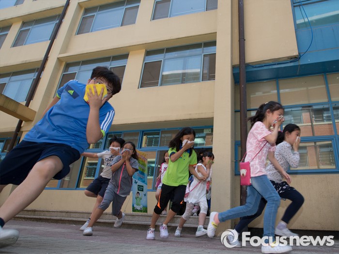 (공주=포커스뉴스) 18일 오후 충남 공주 신월초등학교에서 2016 재난대응 안전한국훈련 일환으로 실시된 현장대응 훈련에서 가스폭발로 인한 화재 발생을 가정, 학생들이 대피훈련을 하고 있다.