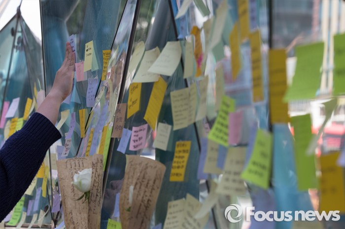 (서울=포커스뉴스) 18일 서울 서초구 강남역 10번출구에서 시민들이 '묻지마 살인' 피해자를 추모하고 있다.