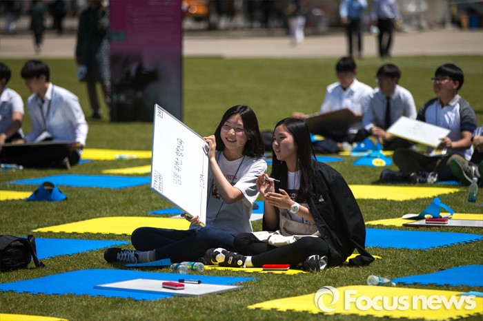 (서울=포커스뉴스) 18일 오후 서울 중구 서울시청 앞 광장에서 열린 '5.18 민주화운동 36주년 기념식 - 5.18 골든벨 행사'에 참석한 학생들이 퀴즈 문제를 풀고 있다.