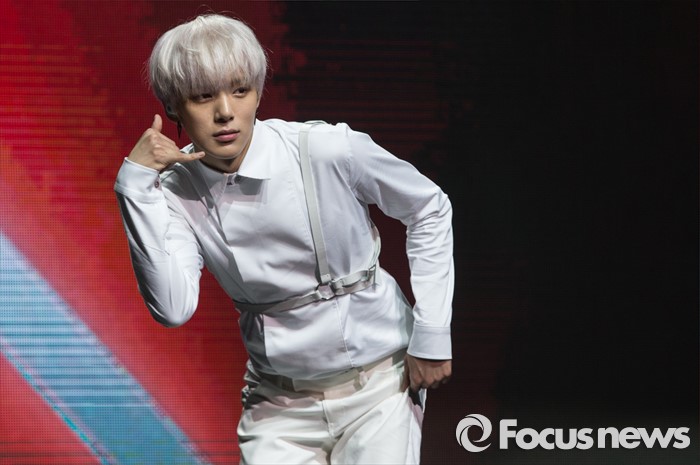 (서울=포커스뉴스) 18일 오후 서울 광진구 예스24 라이브홀에서 열린 아이돌그룹 몬스타엑스의 세번째 미니앨범 'THE CLEAN PART. 1 LOST' 발표 쇼케이스에 참석한 멤버 민혁이 포토타임을 갖고 있다.
