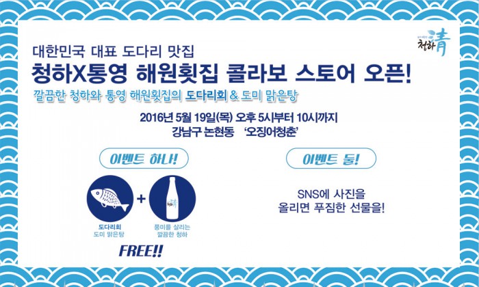 이번 '청하-해원횟집 콜라보 스토어'는 서울 강남 논현에 위치한 '오징어청춘' 매장에서 진행된다.