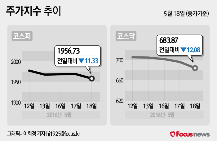 (서울=포커스뉴스) 18일 코스피지수는 전날 보다 0.58%(11.33포인트) 내린 1956.73에 장을 마쳤다. 코스닥지수는 전일 대비 1.74%(12.08포인트) 내린 683.87에 마감했다.