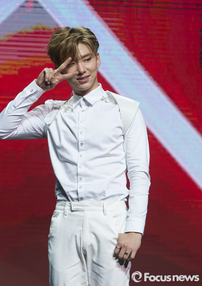(서울=포커스뉴스) 18일 오후 서울 광진구 예스24 라이브홀에서 열린 아이돌그룹 몬스타엑스의 세번째 미니앨범 'THE CLEAN PART. 1 LOST' 발표 쇼케이스에 참석한 멤버 기현이 포토타임을 갖고 있다.