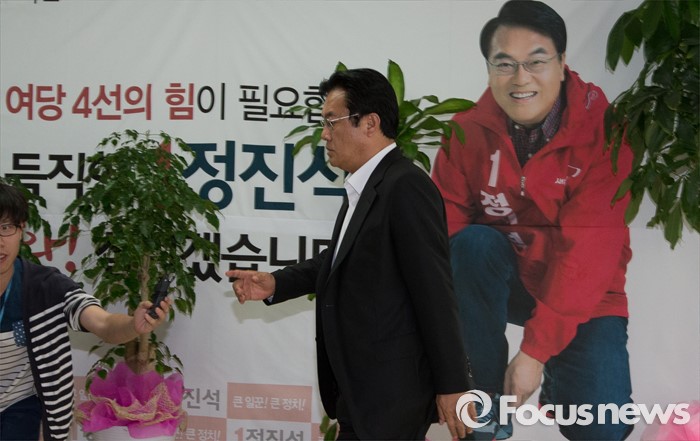 (공주=포커스뉴스) 정진석 새누리당 원내대표가 18일 오후 충남 공주 지난 선거 당시 사용했던 선거사무소에서 측근들과 논의중 잠시 사무실을 나서며 취재진의 질문을 받고 있다.