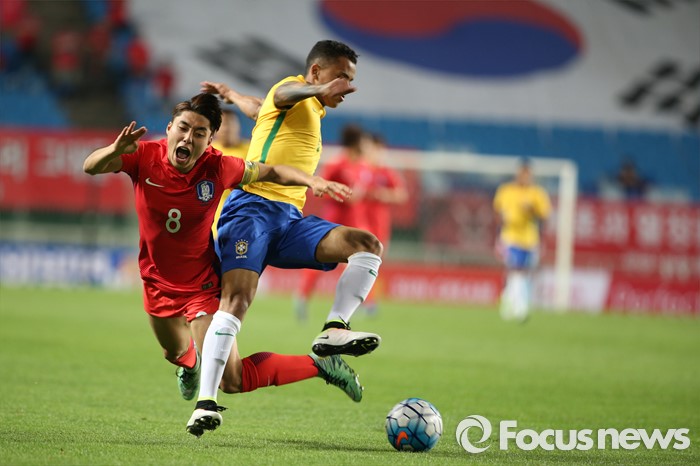 (수원=포커스뉴스) 18일 오후 경기도 수원시 수원월드컵경기장에서 열린 2016 수원 JS컵 U-19 국제청소년축구대회 대한민국과 브라질의 경기에서 이동준이 태클을 당하고 있다.