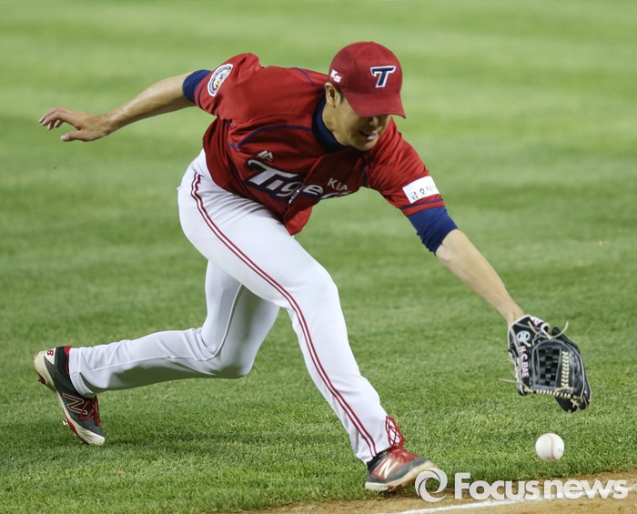 (서울=포커스뉴스) 18일 서울 잠실구장에서 열린 2016프로야구 KIA-두산 경기 8회말 2사 3루에서 두산 오재원의 내야땅볼을 KIA 투수 배힘찬이 잡고 있다.