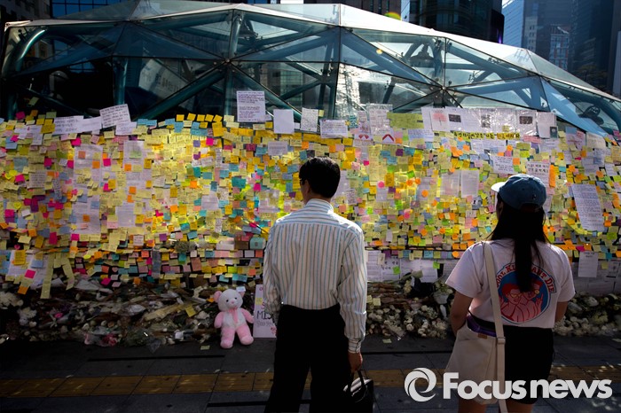 (서울=포커스뉴스) 19일 오전 서울 서초구 강남역 10번 출구에서 출근길 시민들이 '묻지마 살인' 피해자를 추모하고 있다.