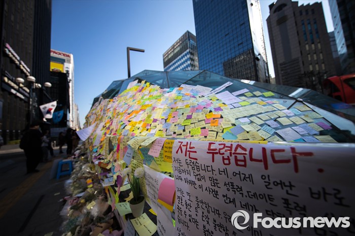 (서울=포커스뉴스) 19일 오전 서울 서초구 강남역 10번 출구에 '묻지마 살인' 피해자를 추모하는 시민들의 메세지가 붙어 있다.