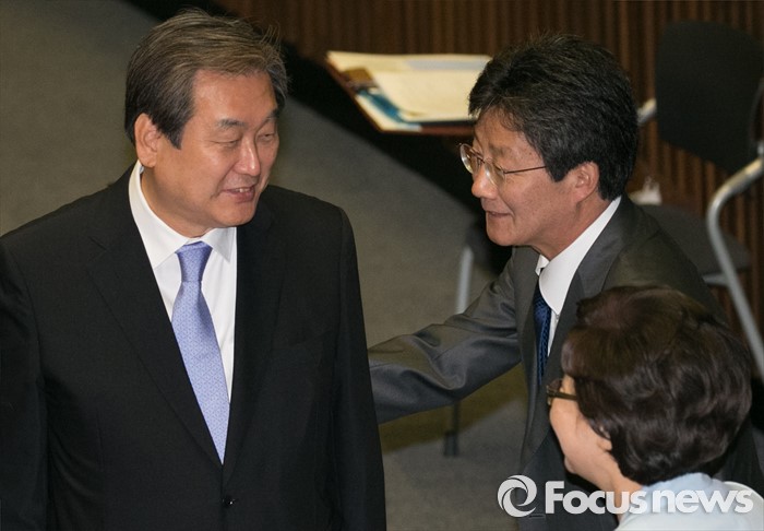 (서울=포커스뉴스) 19일 오전 서울 여의도 국회에서 열린 342회 국회(임시회) 1차 본회의에 참석한 김무성(왼쪽) 새누리당 전 대표와 유승민 무소속 의원이 인사하고 있다.