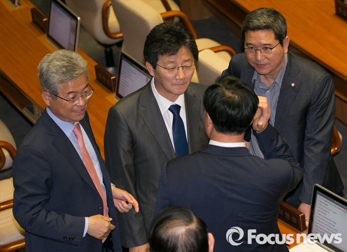 (서울=포커스뉴스) 19일 오전 서울 여의도 국회에서 열린 342회 국회(임시회) 1차 본회의에 참석한 유승민 무소속 의원과 새누리당 의원들이 대화하고 있다.