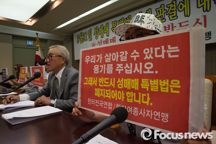 (서울=포커스뉴스) 19일 오전 서울 종로구 프레스센터에서 열린 '성매매 특별법 헌재 판결에 대한 성 노동자 기자회견'에 참석한 성 노동자들이 헌재 판결에 대한 반대를 표하는 손펫말을 들고 있다.