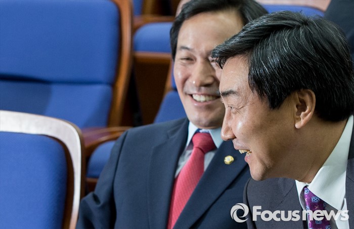 (서울=포커스뉴스) 19일 오전 여의도 국회에서 열린 더불어민주당 의원총회에 참석한 우상호 신임 원내대표와 이종걸 전 원내대표가 대화하고 있다.