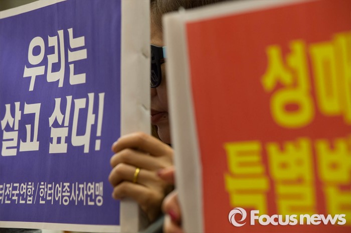 (서울=포커스뉴스) 19일 오전 서울 종로구 프레스센터에서 열린 '성매매 특별법 헌재 판결에 대한 성 노동자 기자회견'에 참석한 한 성 노동자가 헌재 판결에 대한 반대 의견이 적힌 손펫말을 들고 있다.