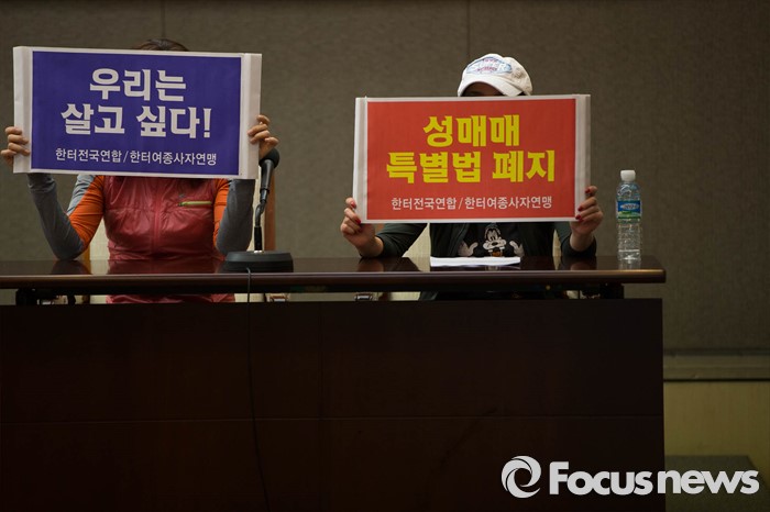 (서울=포커스뉴스) 19일 오전 서울 종로구 프레스센터에서 열린 '성매매 특별법 헌재 판결에 대한 성 노동자 기자회견'에 참석한 성 노동자들이 헌재 판결에 대한 반대 의견이 적힌 손펫말을 들고 있다.