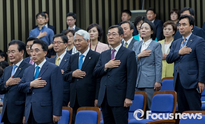 (서울=포커스뉴스) 19일 오전 여의도 국회에서 열린 더불어민주당 의원총회에 참석한 의원들이 국민의례 하고 있다.
