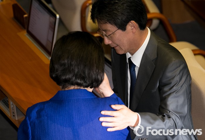 (서울=포커스뉴스) 19일 오전 서울 여의도 국회에서 열린 342회 국회(임시회) 1차 본회의에 참석한 유승민(오른쪽) 무소속 의원이 눈물을 흘리는 김을동 새누리당 전 최고위원을 위로하고 있다.