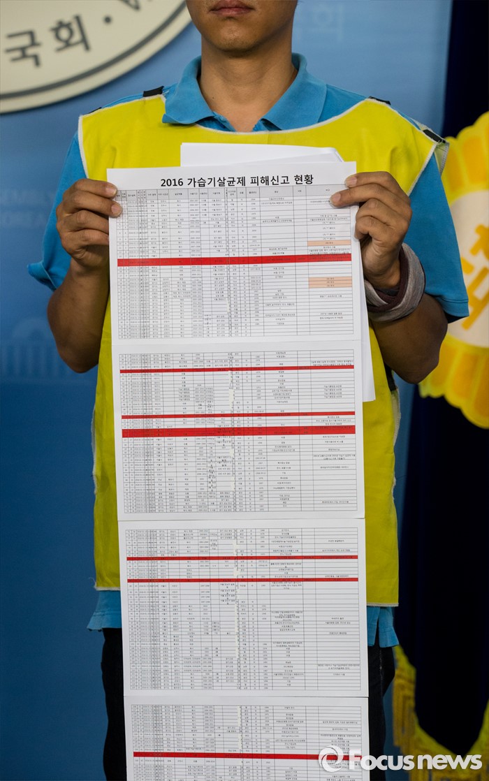 (서울=포커스뉴스) 19일 오전 여의도 국회 정론관에서 열린 '가습기살균제 피해 접수 결과 보고' 관련 기자회견에 참석한 가습기살균제 피해자 가족 안성우씨가 피해 신고 현황이 기록된 종이를 들고 있다.