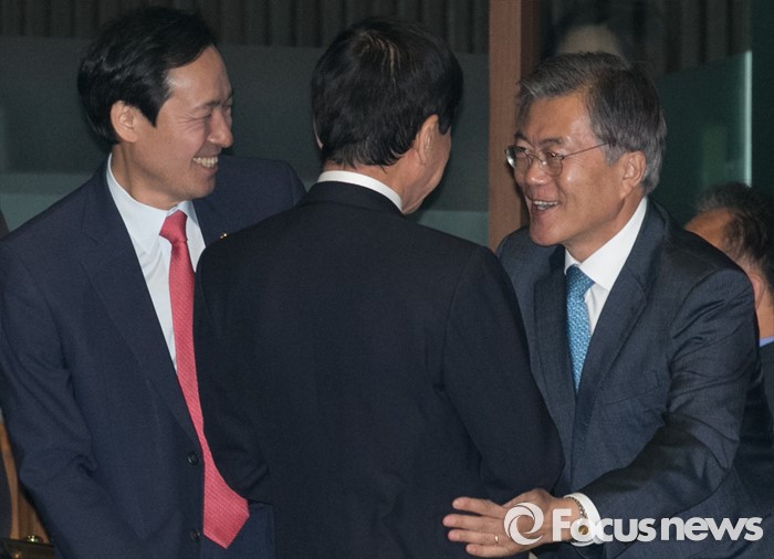 (서울=포커스뉴스) 19일 오전 서울 여의도 국회에서 열린 342회 국회(임시회) 1차 본회의에 참석한 문재인(오른쪽) 더불어민주당 전 대표와 우상호(왼쪽) 원내대표, 진영 의원이 인사하고 있다.