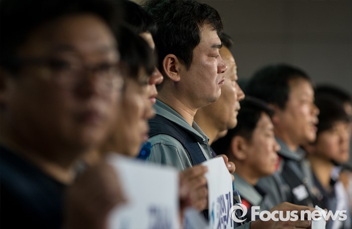 (서울=포커스뉴스) 19일 오전 여의도 국회 정론관에서 열린 '조선산업 발전과 구조조정에 관한 조선업종노조연대 대표자' 기자회견에 참석한 대표자들이 굳은 표정을 짓고 있다.