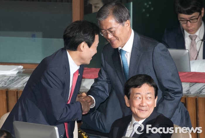 (서울=포커스뉴스) 19일 오전 서울 여의도 국회에서 열린 342회 국회(임시회) 1차 본회의에 참석한 문재인 더불어민주당 전 대표와 우상호 원내대표가 인사하고 있다.