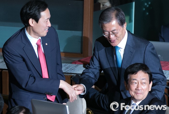 (서울=포커스뉴스) 19일 오전 서울 여의도 국회에서 열린 342회 국회(임시회) 1차 본회의에 참석한 문재인(가운데) 더불어민주당 전 대표와 우상호(왼쪽) 원내대표, 진영 의원이 인사하고 있다.