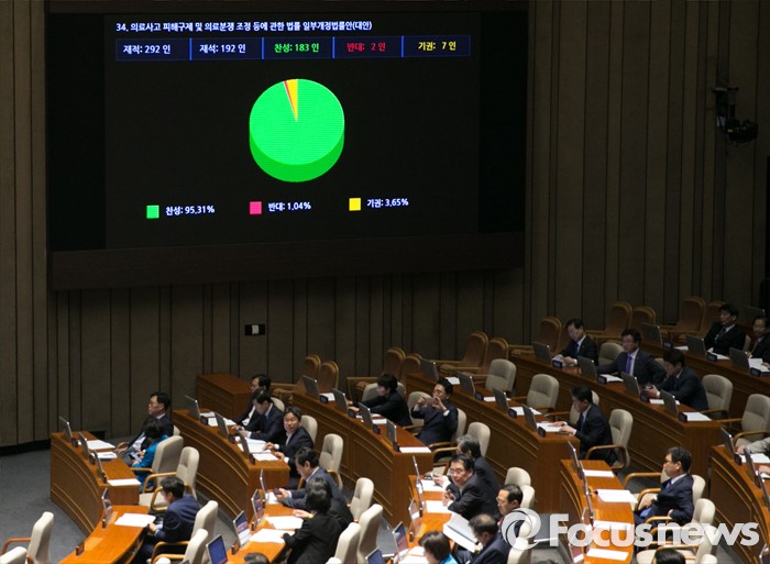 (서울=포커스뉴스) 19일 오전 서울 여의도 국회에서 열린 342회 국회(임시회) 1차 본회의에서 의료사고 피해구제 및 의료분쟁 조정 등에 관한 법률 일부개정법률안(대안)이 재석 192인 중 찬성 183인, 반대 2인, 기권 7인으로 통과되고 있다.