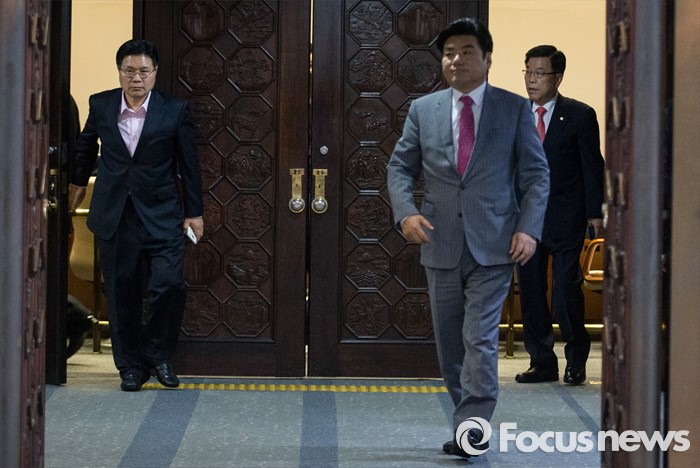 (서울=포커스뉴스) 19일 오후 서울 여의도 국회에서 열린 342회 국회(임시회) 1차 본회의에 참석한 원유철(오른쪽) 새누리당 전 원내대표와 홍문종 의원 등이 본회의가 정회된 후 회의장을 빠져나오고 있다.