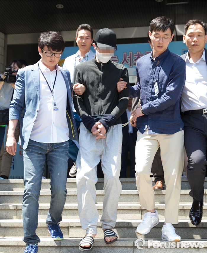 (서울=포커스뉴스) 지난 17일 서울 강남역 인근 노래방 화장실에서 직장인 A씨(23·여)를 흉기로 살해한 혐의를 받고 있는 김모(34)씨가 구속전피의자심문(영장실질심사)을 받기 위해 19일 오후 서울 서초경찰서를 나서고 있다.