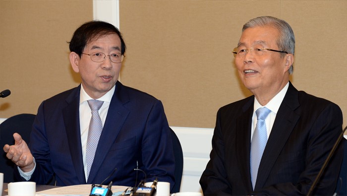 (서울=포커스뉴스) 19일 오전 서울 여의도 국회 귀빈식당에서 열린 20대 국회 무엇을 할 것인가?, 자치분권의 정책과제에 참석한 김종인(오른쪽) 더불어민주당 비대위 대표, 박원순 서울시장이 대화하고 있다. <사진제공=더불어민주당>