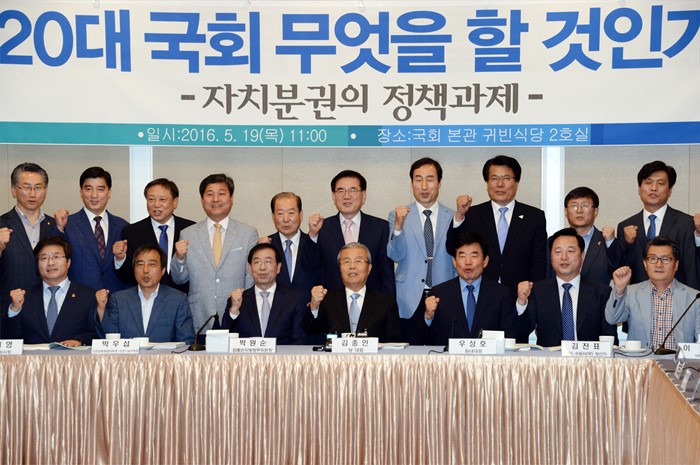 (서울=포커스뉴스) 19일 오전 서울 여의도 국회 귀빈식당에서 열린 20대 국회 무엇을 할 것인가?, 자치분권의 정책과제에 참석한 김종인 더불어민주당 비대위 대표, 박원순 서울시장, 기초단체장과 의원 및 당선인들이 기념촬영을 하고 있다. <사진제공=더불어민주당>