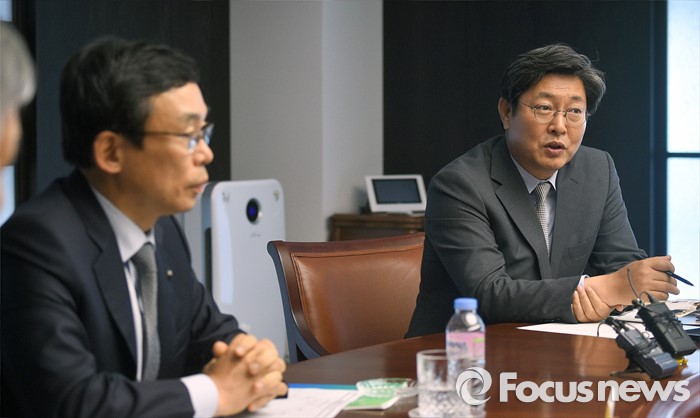 (서울=포커스뉴스) 현장조사에 나선 이춘석(오른쪽) 더불어민주당 어버이연합 등 불법 자금 지원 의혹 규명 진상조사 태스크포스(TF) 위원장이 19일 오후 서울 여의도 전국경제인연합회관에서 이승철 상근부회장 등과 간담회를 하고 있다.