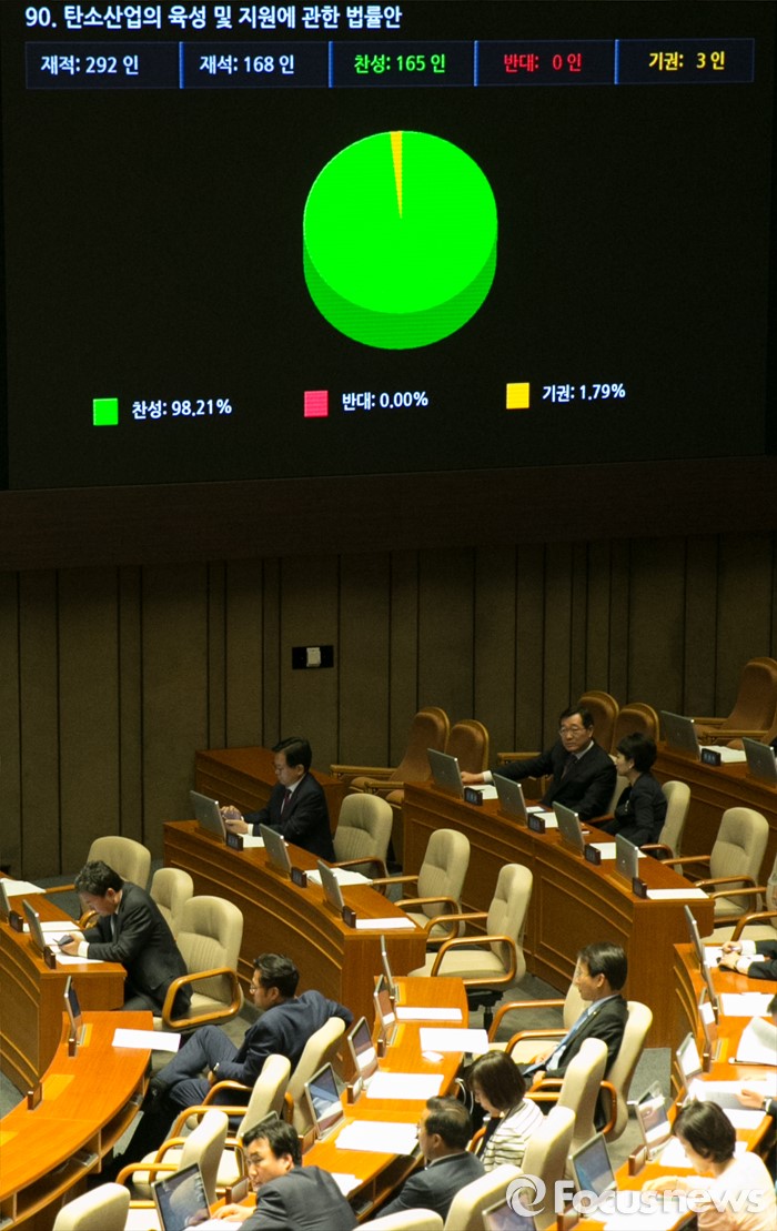 (서울=포커스뉴스) 19일 오후 서울 여의도 국회에서 열린 342회 국회(임시회) 1차 본회의에서 탄소산업의 육성 및 지원에 관한 법률안이 찬성 165인, 기권 3인으로 통과되고 있다.
