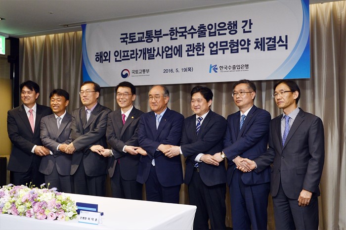 (서울=포커스뉴스) 강호인(왼쪽 네번째) 국토교통부 장관이 19일 서울 영등포구 여의도 글래드호텔에서 이덕훈 한국수출입은행장과 해외인프라개발사업에 관한 업무협약을 체결하고 기념촬영을 하고 있다. <사진제공=국토교통부>