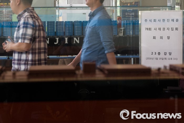(서울=포커스뉴스) 한진해운의 채무조정을 위한 첫 사채권자 집회가 열린 19일 오후 서울 영등포구 한진해운 본사 로비로 사람들이 지나가고 있다.