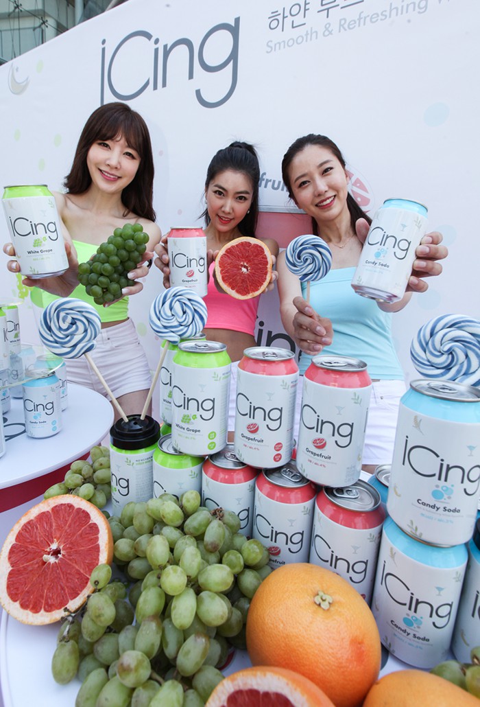 국순당은 기존 아이싱 자몽도 신제품 출시에 맞춰 디자인을 새롭게 변경해 선보였다.신제품 아이싱 청포도·캔디소다를 알리기 위한 행사에서 모델들이 제품을 선보이고 있다.<사진제공=국순당>