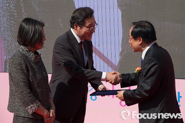 (서울=포커스뉴스) 19일 오후 서울시청광장에서 열린 '제1회 건강가정 다출산 범국민대회'에 참석한 이낙연(가운데) 전라남도 도지사가 다출산 광역시, 도 대상을 수상하고 있다.
