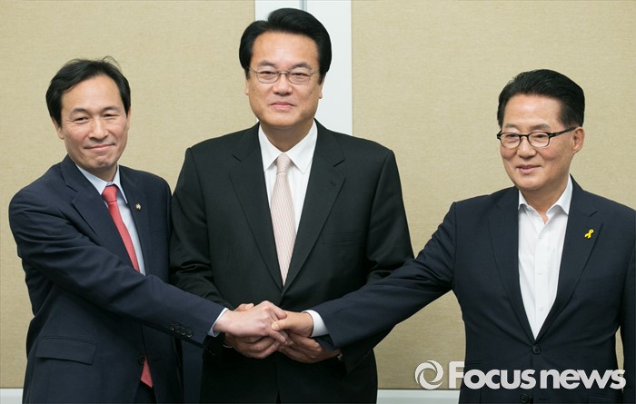 (서울=포커스뉴스) 19일 오후 서울 여의도 국회 귀빈식당에서 20대 국회 원구성 등 협상을 위해 열린 3당 원내대표 회동에 참석한 의원들이 포즈를 취하고 있다. 왼쪽부터 우상호 더불어민주당 원내대표, 정진석 새누리당 원내대표, 박지원 국민의당 원내대표.
