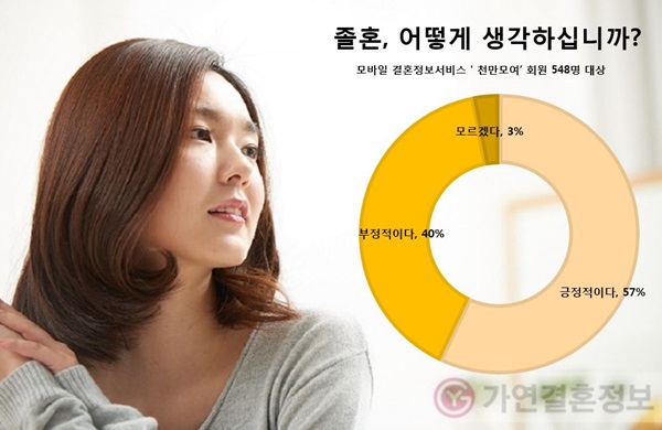결혼정보회사 가연은 부부의 날(5월21일)을 앞두고 모바일 결혼정보서비스 '천만모여' 회원 548명(남320 여228)을 대상으로 '졸혼에 대해 어떻게 생각하십니까'를 주제로 설문조사를 실시한 결과, 미혼남녀 57%가 긍정적인 반응을 보였다고 19일 밝혔다.