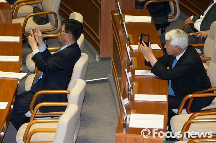 (서울=포커스뉴스) 19일 오후 서울 여의도 국회에서 열린 342회 국회(임시회) 1차 본회의에 참석한 의원들이 정의화 국회의장의 마무리 발언 모습 등을 촬영하고 있다.