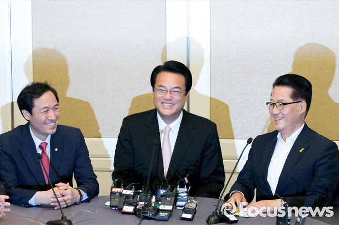 (서울=포커스뉴스) 19일 오후 서울 여의도 국회 귀빈식당에서 20대 국회 원구성 등 협상을 위해 열린 3당 원내대표 회동에 참석한 정진석(가운데) 새누리당 원내대표, 우상호(왼쪽) 더불어민주당 원내대표, 박지원 국민의당 원내대표가 대화하고 있다.