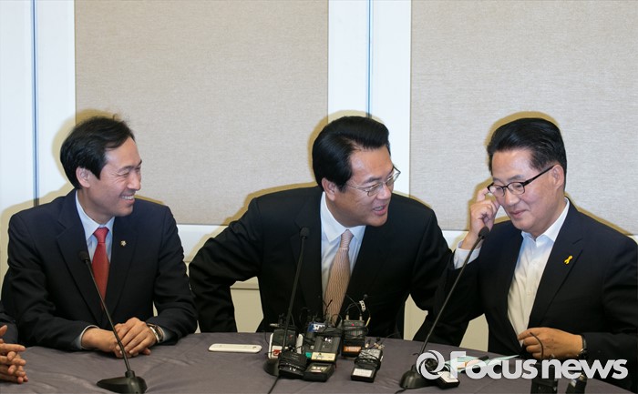 (서울=포커스뉴스) 19일 오후 서울 여의도 국회 귀빈식당에서 20대 국회 원구성 등 협상을 위해 열린 3당 원내대표 회동에 참석한 정진석(가운데) 새누리당 원내대표, 우상호(왼쪽) 더불어민주당 원내대표, 박지원 국민의당 원내대표가 대화하고 있다.