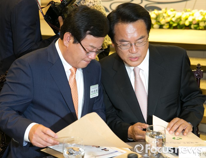 (서울=포커스뉴스) 19일 오후 여의도 서울시티클럽에서 열린 충청 향우 친선의 밤 행사에 참석한 정진석(오른쪽) 새누리당 원내대표와 이은권 당선인이 대화하고 있다.