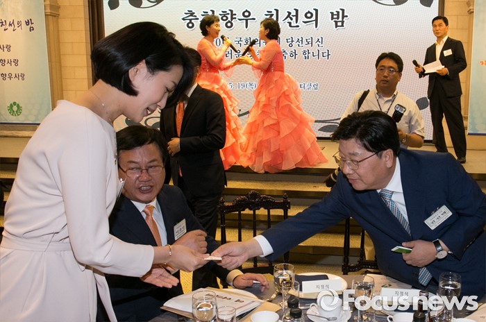 (서울=포커스뉴스) 19일 오후 여의도 서울시티클럽에서 열린 충청 향우 친선의 밤 행사에 참석한 권선택(오른쪽) 대전시장과 김수민(왼쪽) 국민의당 당선인이 인사하고 있다.