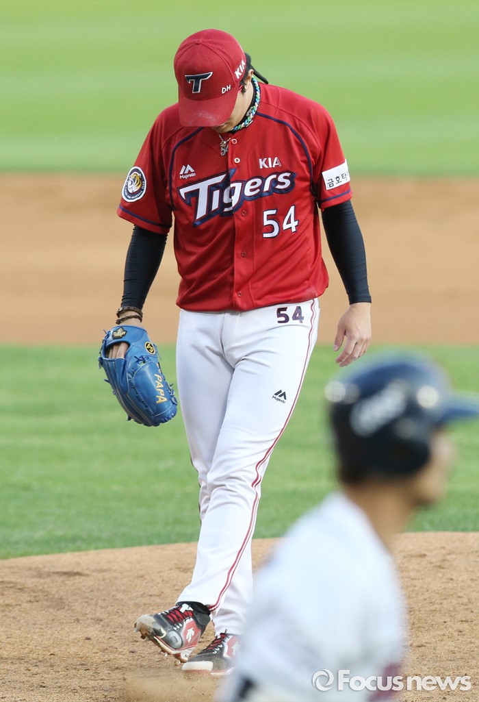 (서울=포커스뉴스) 19일 서울 잠실구장에서 열린 2016프로야구 KIA-두산 경기 1회말 1사후 KIA 선발투수 양현종이 두산 오재원을 볼넷으로 진루시키고 마운드의 흙을 고르고 있다.