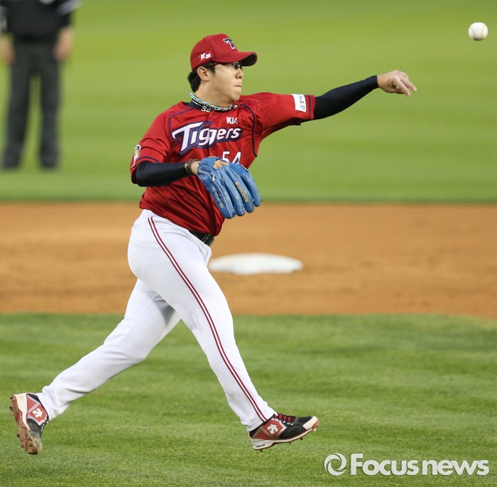 (서울=포커스뉴스) 19일 서울 잠실구장에서 열린 2016프로야구 KIA-두산 경기 2회말 2사후 KIA 투수 양현종이 두산 허경민의 땅볼 타구를 잡아 1루로 송구하고 있다.