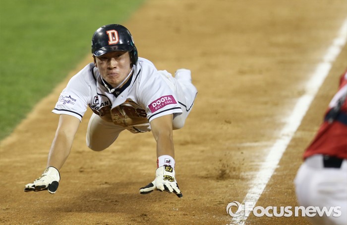 (서울=포커스뉴스) 19일 서울 잠실구장에서 열린 2016프로야구 KIA-두산 경기 4회말 1사 1,3루에서 두산 박건우의 우익수 희생 플라이때 3루주자 허경민이 헤드 퍼스트 슬라이딩으로 득점하고 있다.